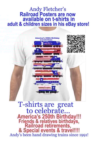 Andy's posters are now available on t-shirts in adult & children sizes in his Ebay store. Hundred of different t-shirts to choose from; steam, fallen flags, passenger & freight.
