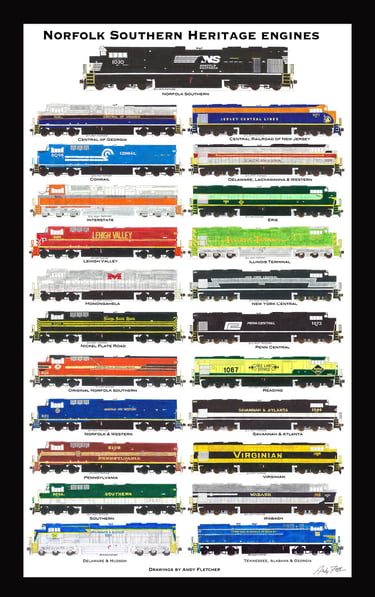 Andy Fletcher is a well known railroad artist, designer, and advocate for railroads. Over the past 30 years, he has hand-drawn over 4,000 locomotives, cabooses, and railcars, capturing the essence of American railroading from steam to modern diesel and electric trains. He is the designer of the Burlington Northern SD70 Executive MACs, the Norfolk Southern 30th Anniversary Heritage engines, the MTA Metro-North 40th Anniversary Heritage P32 locomotives, and other diesel locomotives. His drawings include freight and passenger trains available in a large variety of products for railroads, museums, tourist railroads and railfan's.
