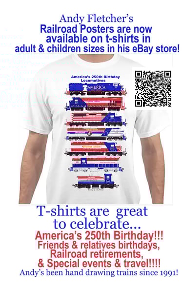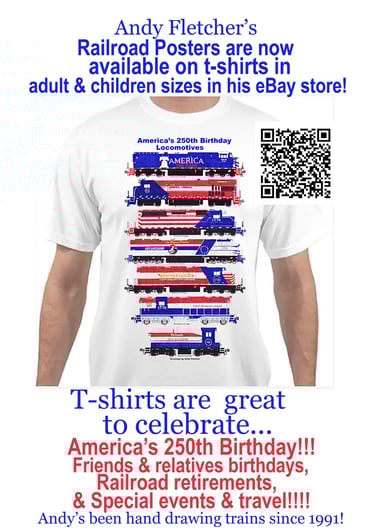 Andy's posters are now available on t-shirts in adult & children sizes in his Ebay store. Hundred of different t-shirts to choose from; steam, fallen flags, passenger & freight.