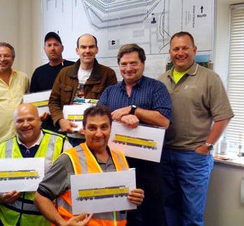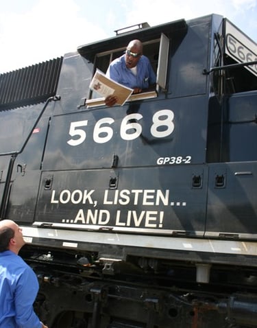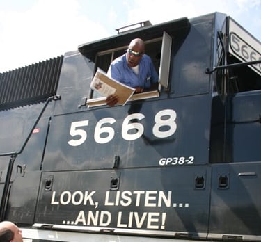 Andy giving a N&W 611 print to the engineer of the Operation Lifesaver train in Radford, VA in 2009
