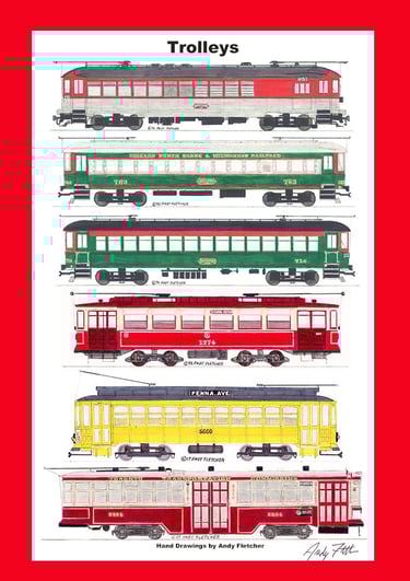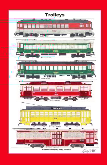 Andy is drawing more trolleys, streetcars and cable cars available as 11"x17" posters, 12"x18" matted posters, magnets & stickers
